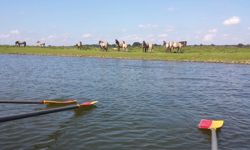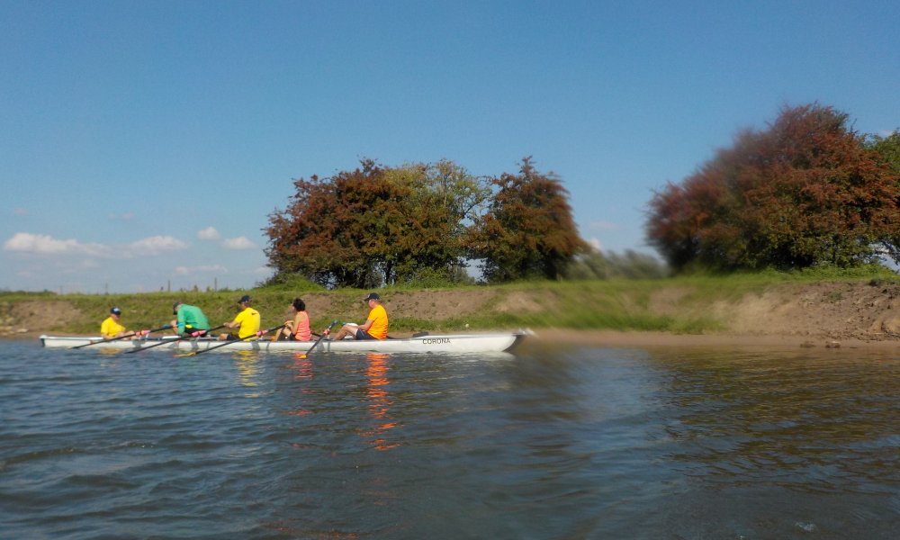 Impressie van het oproeien van de Corona en de Graaf Egbert naar Wageningen, met stops in WIjk bij Duurstede en lunch op het strand.