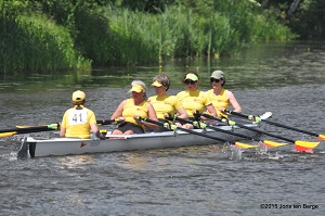 Met mooi weer maar een straffe bries tegen werd afgelopen zondag voor de 16e keer de Dommelregatta geroeid. Voor de eer van de Helling streed een vrouwen C4 met Anja op slag en daarachter Nel, Corina, Eugenie en Judith als zeer stimulerende stuurvrouw. Het was hen vooral te doen hun baanrecord uit 2009 van 33:20 te verbeteren dat ze in dezelfde formatie gevestigd hadden. Door de forse tegenwind werd dat doel niet gehaald, maar met een tijd van 34:36 over 7,5 km zaten ze er dichtbij. Ze waren trots op hun resultaat want niet alleen hadden ze veruit de snelste VC4 tijd, maar wisten ze ook nog een drietal vrouwenploegen in het veel lichtere gladde materiaal achter zich te laten. De Dommelregatta is een leuke wedstrijd. Volgend jaar hopen we met meer Hellingploegen deel te nemen!